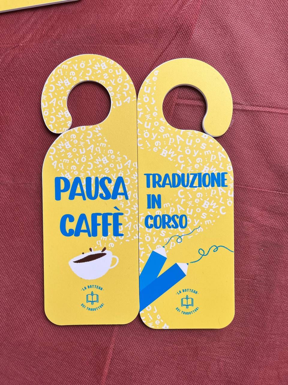 Gli appendiporta firmati “La bottega dei traduttori” in cartoncino duro plastificato, per comunicare a chi vive con voi se possono disturbarvi per un caffè o tè o se il lavoro chiama e non ammettete distrazioni!